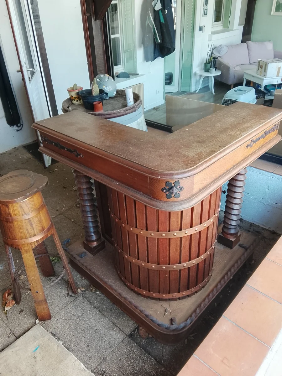 Petit bar en bois et cuivre en disposition en L 92 sur 92 cm avec 2 tabouret en forme de fut
