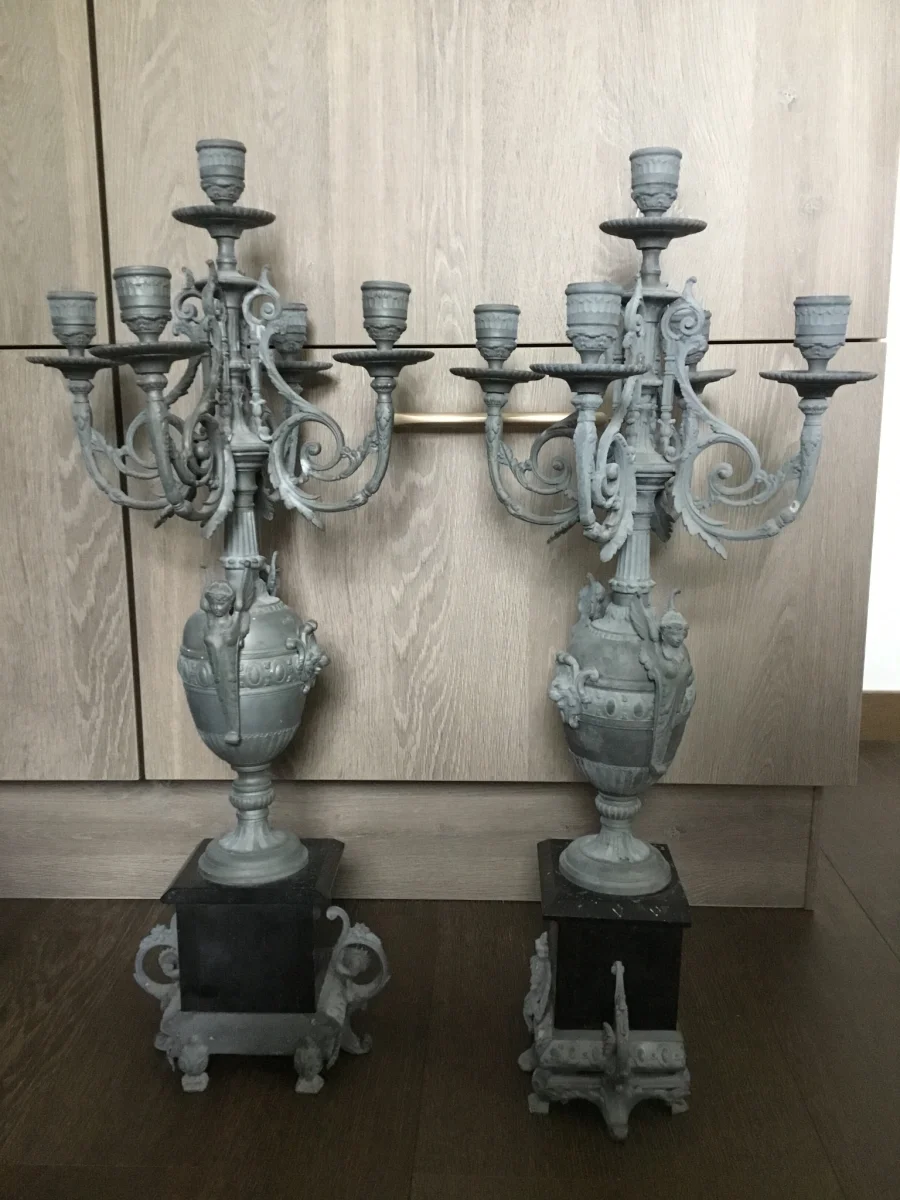 Paire de candélabres dans le goût de Barbedienne. Composition de métal et marbre. Dimensions : 62 cms x 21 x 21.